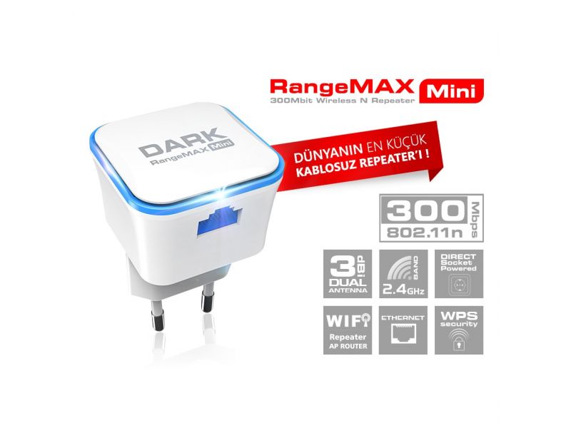 WRT360 RangeMAX Gücü ile Karşınızda Tüm koşullarda yüksek menzil vaat eden Dark RangeMAX WRT360 Mini, marka ve model bağımlılığını oratan kaldırarak her modem ve router ile kusursuz çalışır. Modeminizden aldığı sinyal ile evinizde ya da ofisinizde kör nokta bırakmadan her alana 300Mbps'lik yüksek hızlı interneti ulaştırabileceksiniz. WRT360 Mini'yi, doğrudan fişe takılan adaptörsüz ergonomik yapısı ve Türkçe arayüzü sayesinde kolayca kurulum yapabilirsiniz. 802.11n teknolojisi ile 300Mbps'e varan yüksek süratli kablosuz bağlantı hızından ev ve ofisinizin her noktasında faydalanabilirsiniz. Türkçe ve Kolay Kullanımlı Arayüz Dark WRT360 Mini, gelişmiş 4 ana erişim modu ile kolayca kablolu/kablosuz internet bağlantısına erişmeniz için Türkçe olarak tasarlanmıştır. DARK WRT360; Erişim Noktası(AP), Yönlendirici(Router), Tekrarlayıcı(Repeater) ve İstemci modlarıyla tüm bağlantı senaryolarına uygun şekilde bağlantınızı yapılandırabilir, bu sayede 300Mbps hızında yüksek süratli Wireless-N internetin keyfini her noktada kolayca yaşayabilirsiniz. Hafif, Taşınabilir Yapısı ile Gittiğiniz Her Yerde Sizinle Dünya'nın en küçük repeater'ı Dark WRT360 Mini, boyutu küçük fakat işlevi çok büyük. Ergonomik yapısı ve ebatları sayesinde dilediğiniz yere yanınızda taşıyabilirsiniz. Tek yapmanız gereken ona bir priz bulup gücünü vermek.