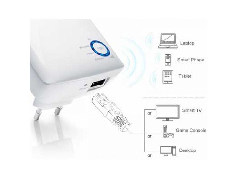 TL-WA850RE’nin tek ethernet portu sayesinde extender, Blu-ray® oynatıcı, oyun konsolları, DVR’ler ve internet TV’leri gibi kablolu cihazları bağlamak için kablosuz bir adaptör işlevi görür. Aynı zamanda, bu cihaz kablosuz ağı da paylaşabilir.
